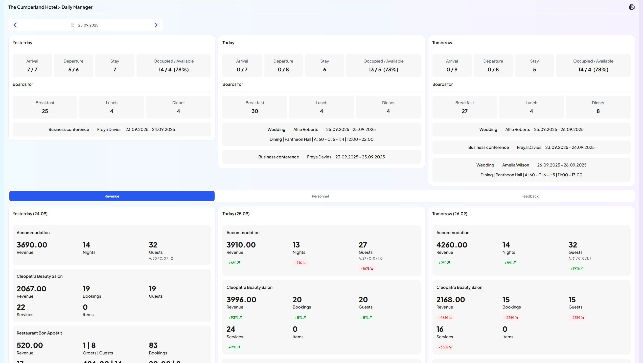Ако все още започвате всяка сутрин с отваряне на пет системи, гонене на последни промени и събиране за статус среща, губите време, което бихте могли да вложите в лидерство. Inntelligent's Daily Manager заменя ежедневния хаос с едно-единствено, живо табло на хотела, което показва пристигания, заминавания, заетост, планове за изхранване, приходи и известия – непрекъснато обновявано и с възможност за действия от всяко устройство