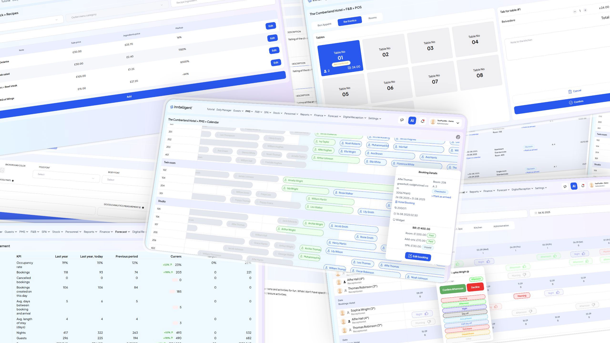 Управлявайте цялата си дейност от една интелигентна платформа. PMS, система за резервации, приходи, дигитална рецепция, POS система за храни и напитки, красота и спа, финанси, складови наличности, персонал и анализи – красиво свързани.